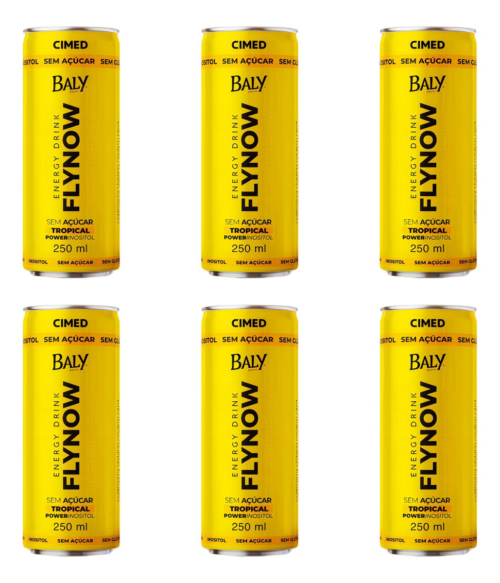 Kit com 6 energéticos Baly Flynow Tropical Sem Açúcar, cada lata de 250ml. Esta bebida oferece sabor tropical refrescante sem açúcar, mantendo as calorias sob controle. Com cafeína e inositol, é ideal para quem precisa de um impulso de energia rápido sem adicionar calorias. O produto é não alcoólico e vem em embalagem prática de 250ml para consumo imediato. Armazene em local fresco e seco, agite antes de abrir e consuma gelado. Recomenda-se moderação e atenção à ingestão de cafeína. Conteúdo adequado para adultos; não recomendado para crianças. Informação nutricional e advertências estão na embalagem.