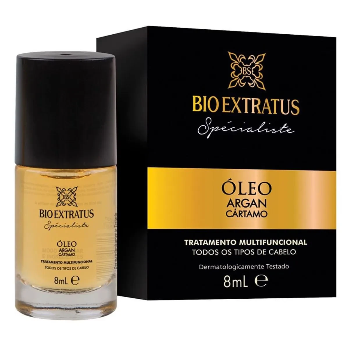 Óleo capilar com Argan e Cártamo em embalagem de 8ml. Fórmula leve para uso cosmético diário em cabelos, proporcionando brilho e nutrição sem deixar o fio pesado. Produto Bio Extratus, desenvolvido para aplicação nas pontas e comprimento, com textura suave que facilita a espalhabilidade.