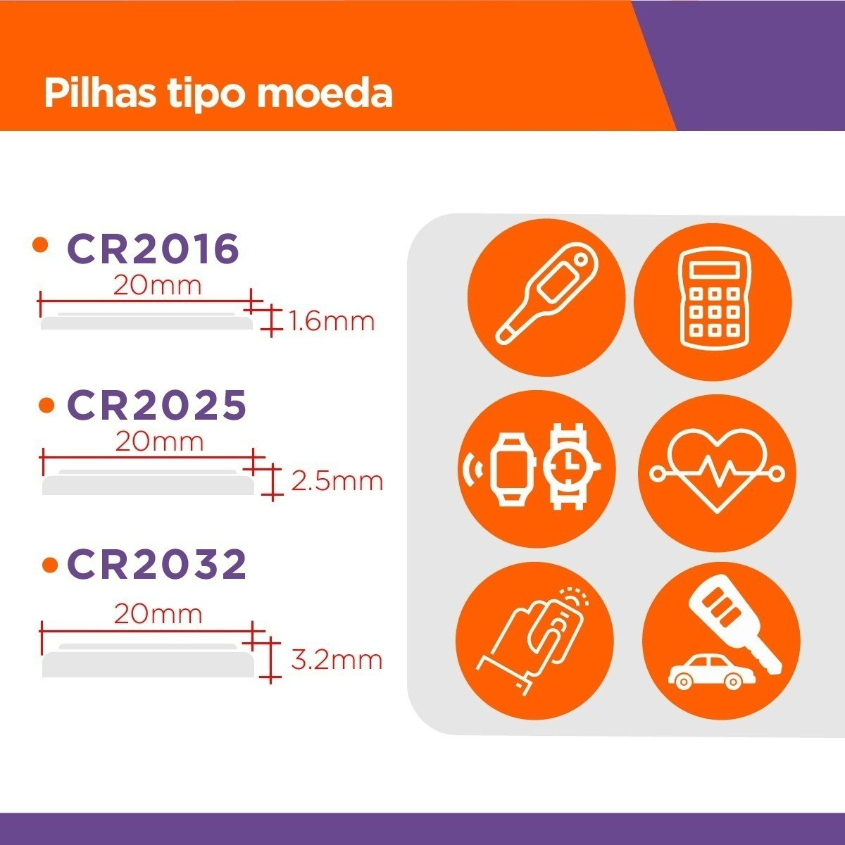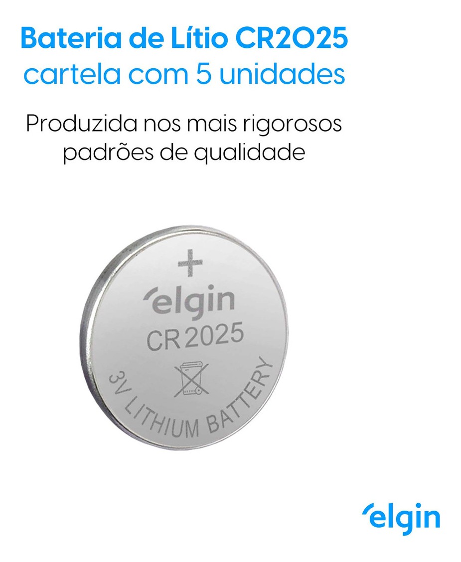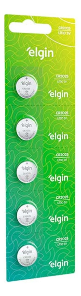 Pilhas de lítio CR2025 da Elgin.\nKit com 5 unidades. As baterias são finas, leves e compatíveis com dispositivos compactos como controle remoto, relógio, brinquedos e sensores que utilizam o formato CR2025. Cada unidade oferece voltagem nominal de 3V e não é recarregável. O kit facilita reposições e mantém seus aparelhos funcionando sem interrupções. Ideal para quem busca uma solução prática e confiável para dispositivos que exigem pilhas de botão com esse formato.
