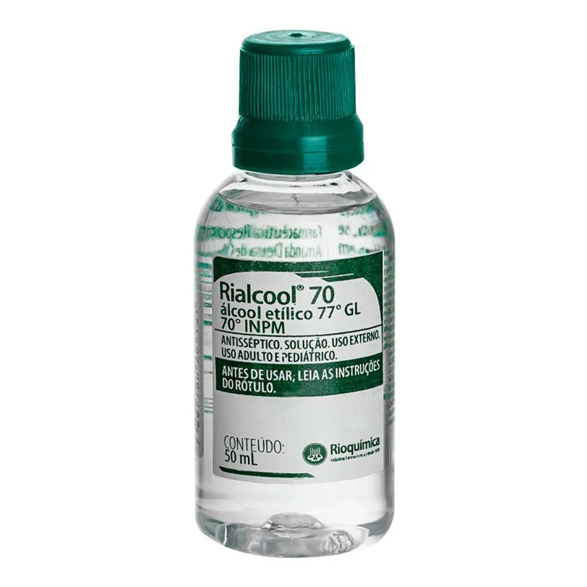 Rialcool 70% é álcool etílico hidratado com concentração de 70% em peso (70 INPM). Apresentação de 50 ml em embalagem prática para uso tópico.